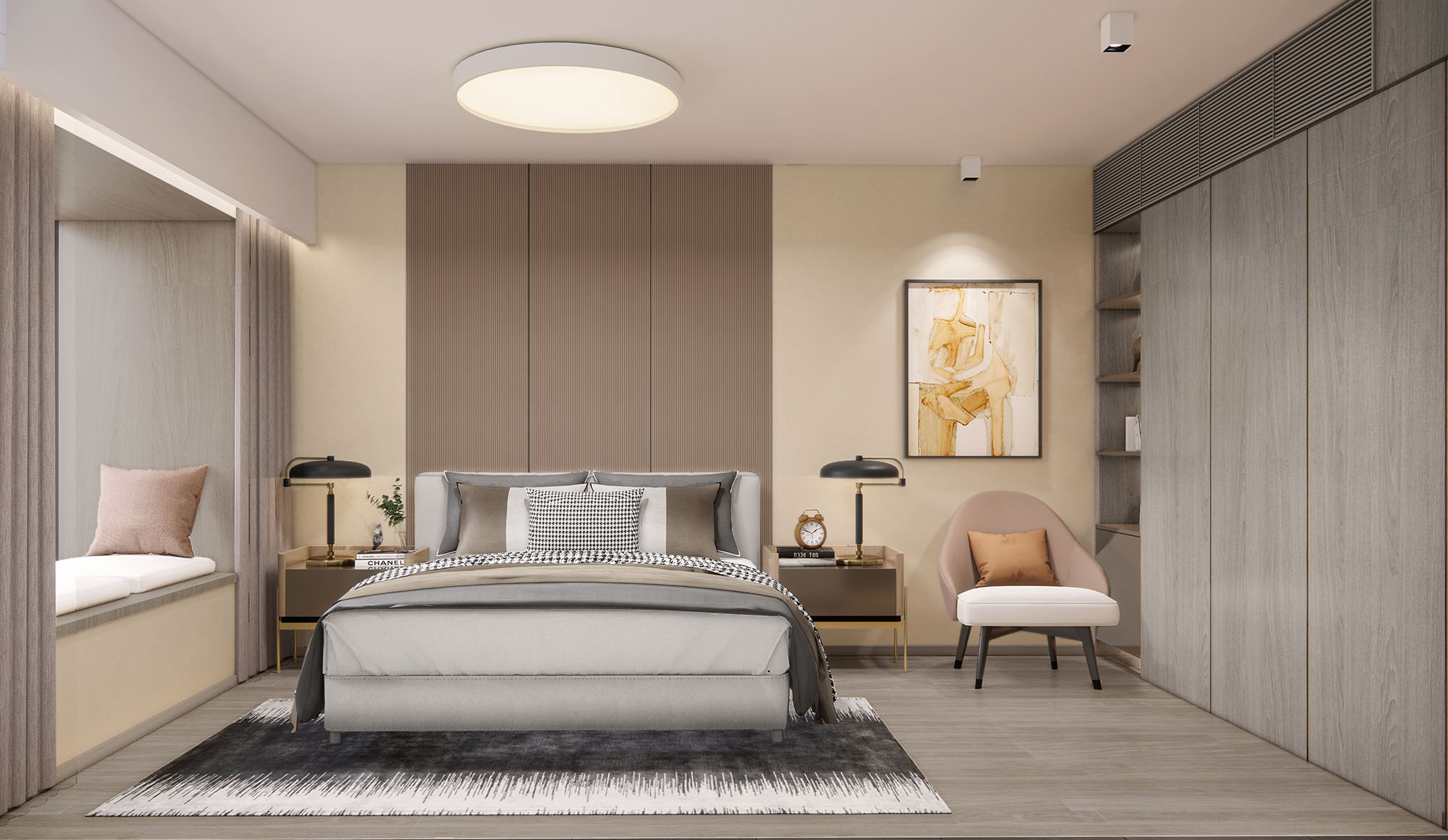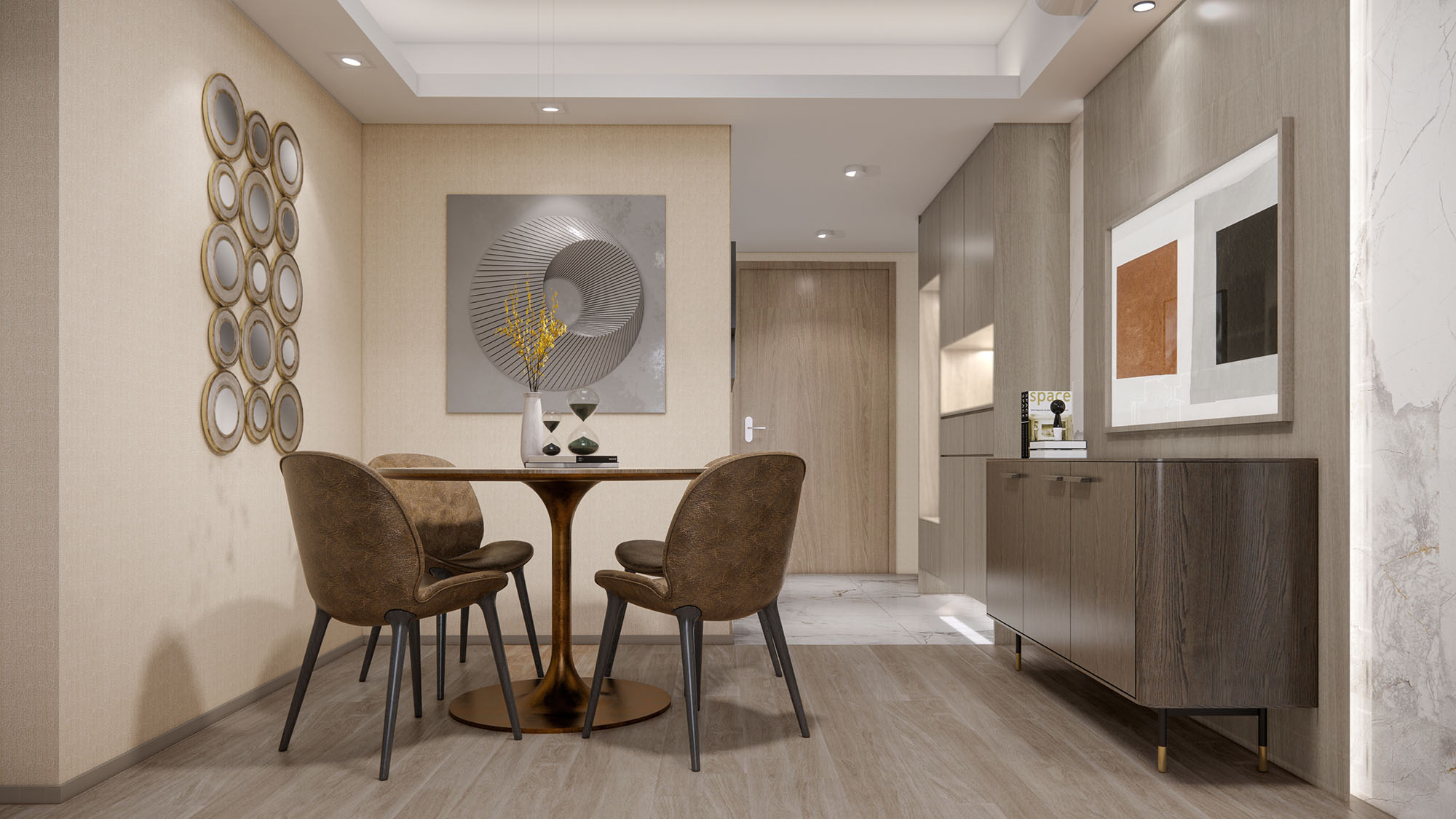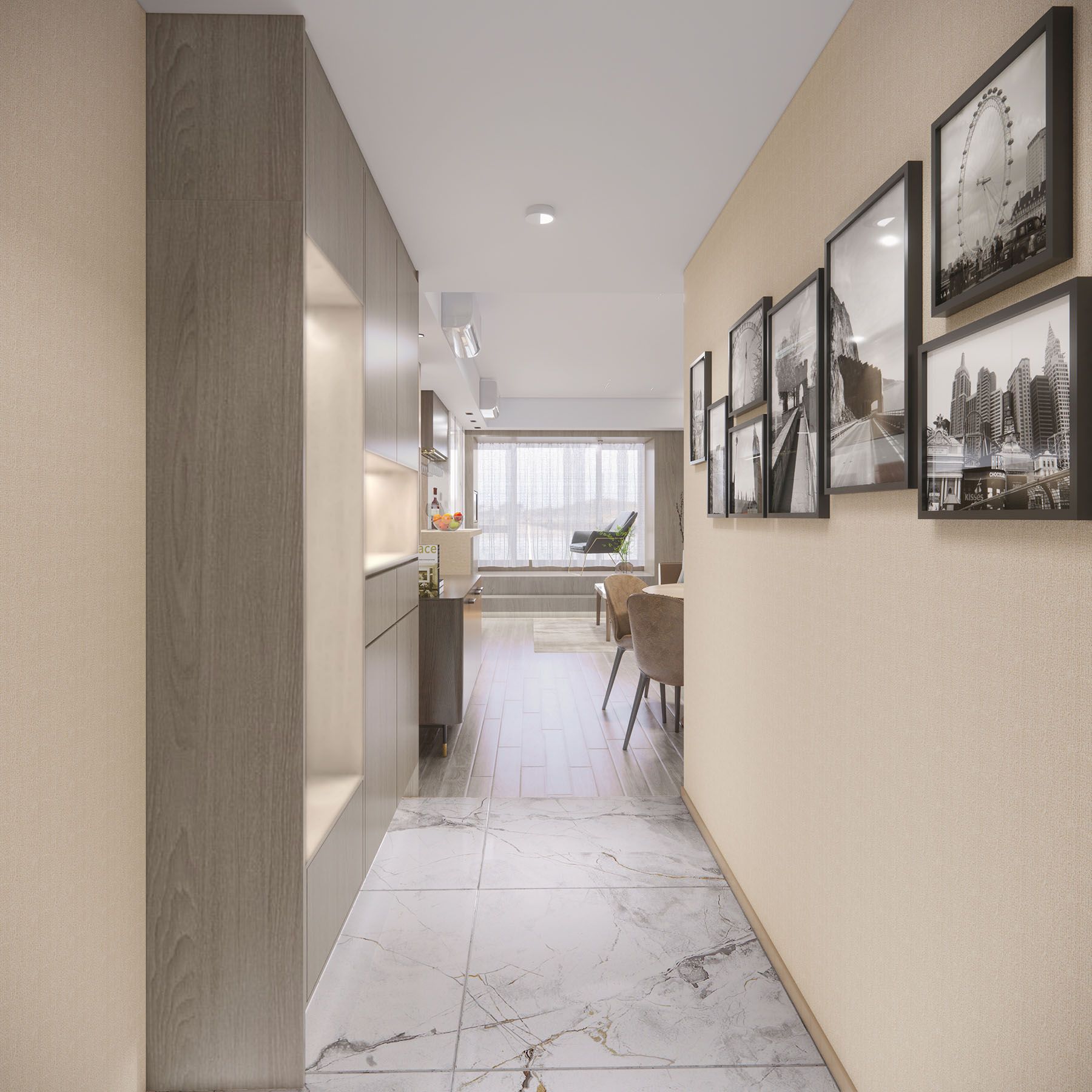 The main activity area adopts solid wood composite floor to make walking more comfortable; Light color wall cloth and texture paint make the home space calm and warm; Gray tone stone tiles are stain resistant and easy to clean, showing a higher sense; The metallic texture adds a touch of touch and flexibility to the whole space.